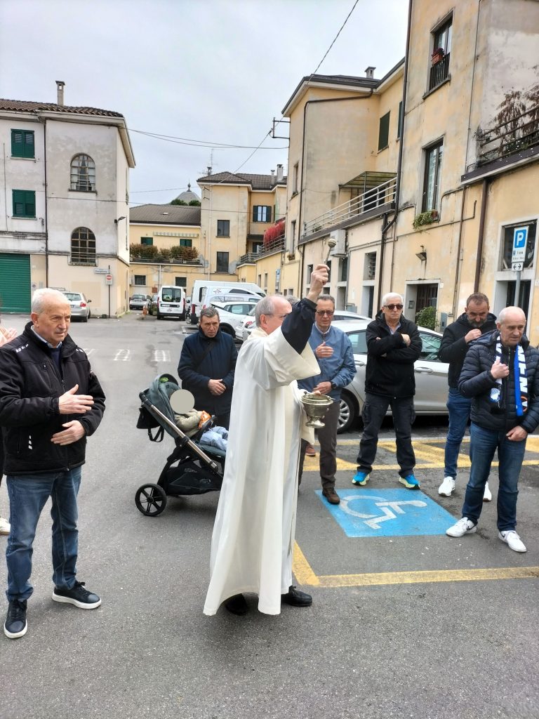 Il parroco di Dalmine, Don Fabio Zucchelli, durante la benedizione del nuovo mezzo